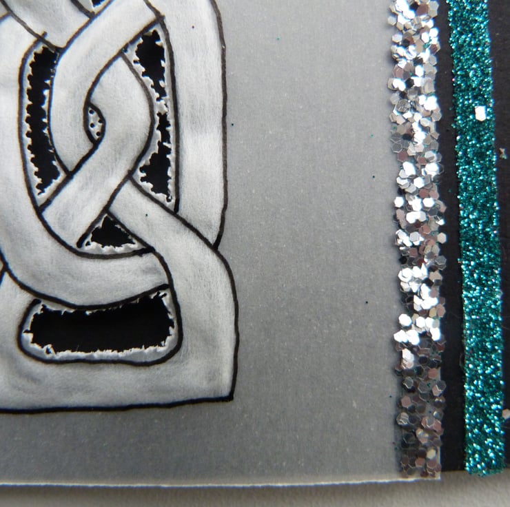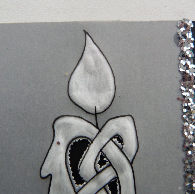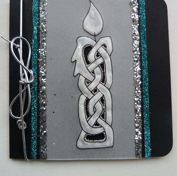 Traditional Celtic design candle on parchment embossed and perforated and matted onto black card for amost dramatic effect. Embellished with fine glitter and silver rope cord bow. Inserl left blank for yoiur own message and supplied with quality matching envelope. Cello wrapped.