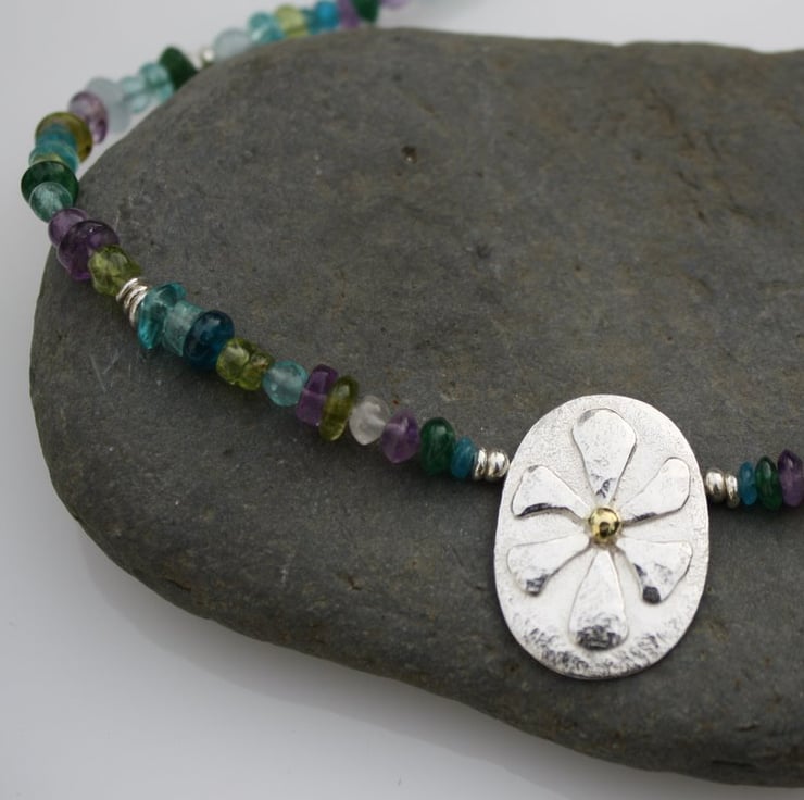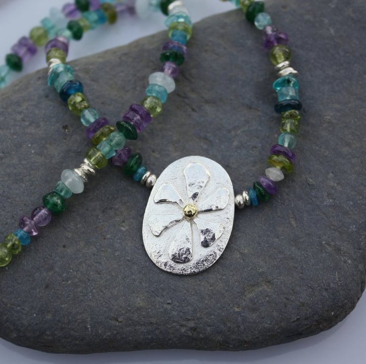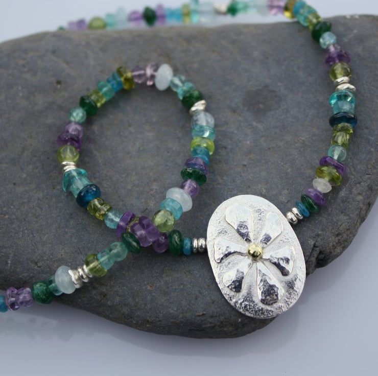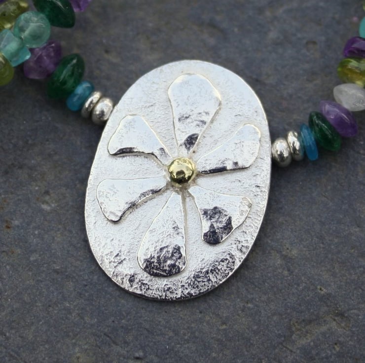 A handmade oval silver and 18ct gold fused flower pendant focal bead is strung with a bright fresh ,colourful mix of semi-precious gemstone beads.