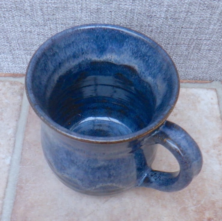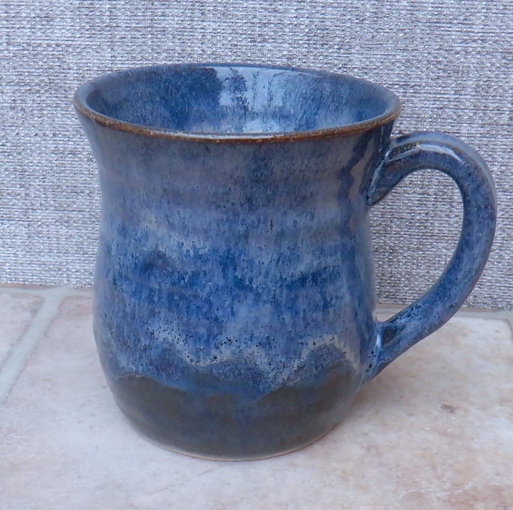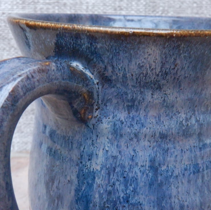 I threw this extra large mug on my pottery wheel using strong off-white stoneware clay, and finished it in a lovely combination of dark navy blue and purple reactive glazes.