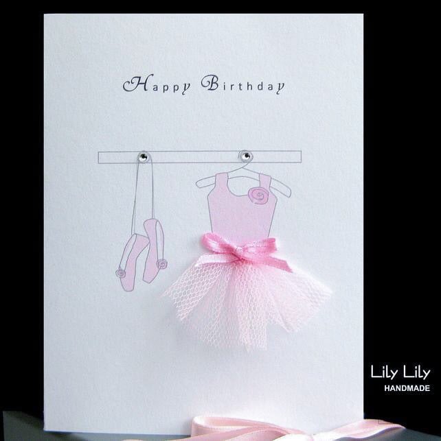 A pretty personalised birthday card for a little ballerina handmade by Lily Lily Handmade. The ballerina card features a ballerina outfit, ballet shoes and ballet leotard and ballet tutu skirt. A design that incorporates a 3D net delicate pale pink ballerina tutu skirt to embellish the design I have drawn digitally. This cute 3d card is further embellished with delicate pink satin ribbon & clear rhinestones.