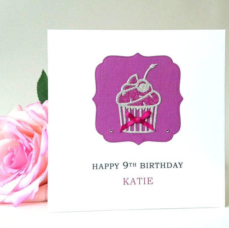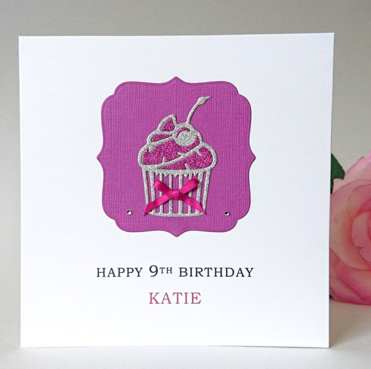 A modern stylish personalised birthday card featuring a sparkly cupcake design embellished with a fuschia coloured ribbon bow and rhinestones. Perfect for sending a personalised card (name and/or any age, including for example 9th birthday, 29th birthday, 40th birthday etc) in a lovely special way. Please provide your requirements in the note to seller at checkout.