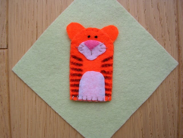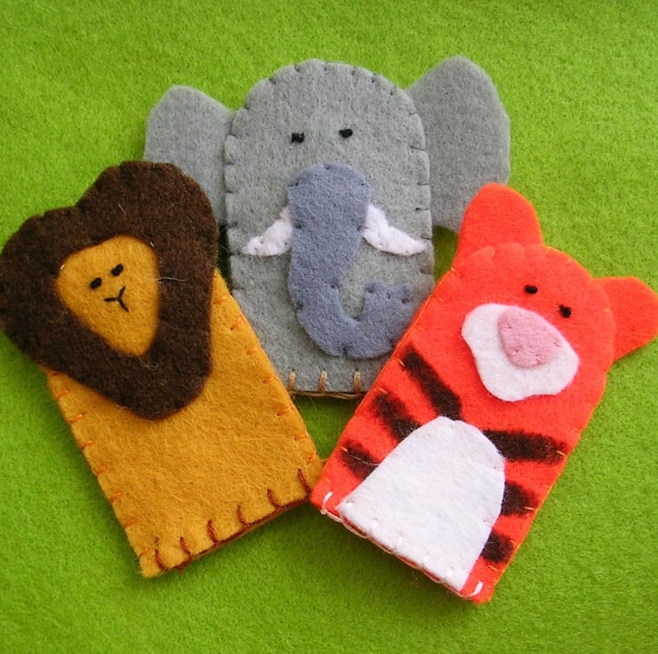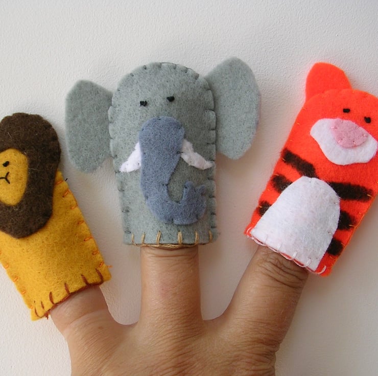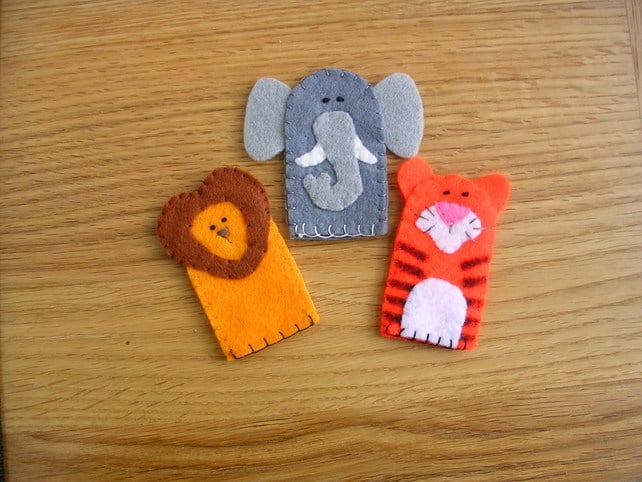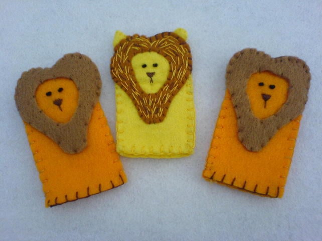 These adorable finger puppets are handmade out of felt and embroidered. They are approximately 6.5cm tall and 4cm wide and securely stitched, making a lovely present. the set consists of 3 animals - a lion, an elephant & a tiger.