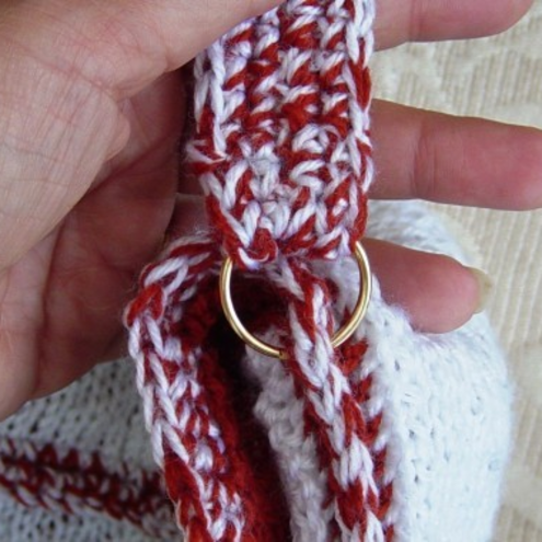 The strap or handle for the handbag has been crocheted in both the yarns together, giving a mottled and very textured look. To attach them to the handbag, two goldtone 2.5cm split rings have been employed, by threading them through the side seams of the handbag & sewing over the strap to secure to the loop.