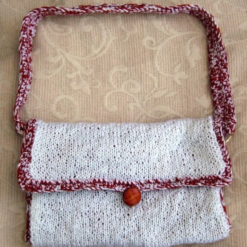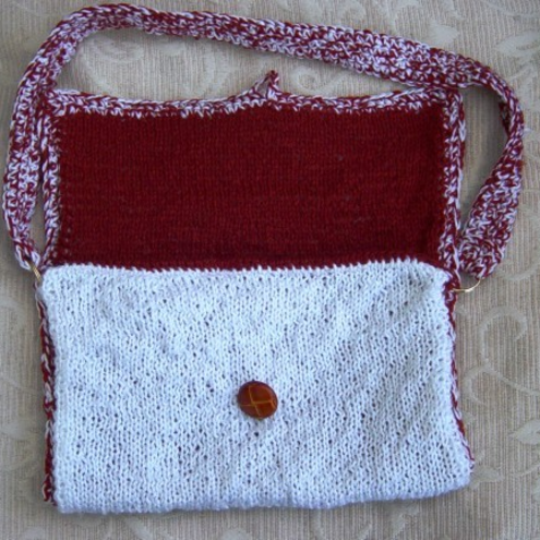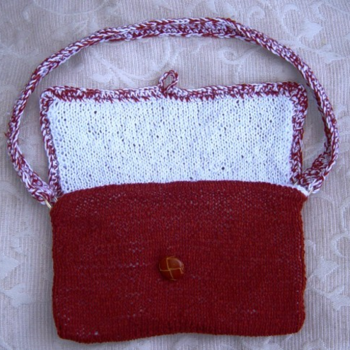 Russet & White is a Hand knitted & crocheted handbag, that is completely reversible, with a crocheted handle strap, goldtone loops & short flap over top & two lucite buttons for closure on either side.