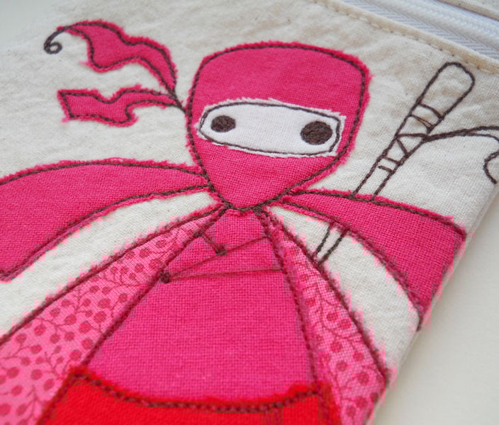 this not-so-sneaky ninja is in bright pink and red cotton fabrics, which are layered and appliqued onto pre-washed calico, before i draw onto them with free machine embroidery. i then make them up into the finished item.