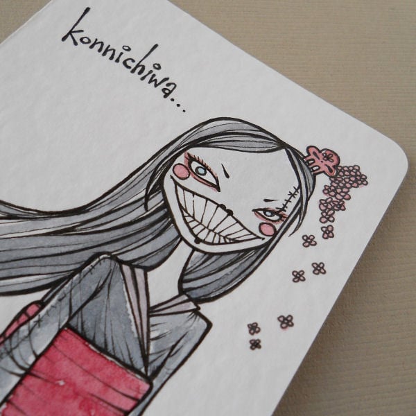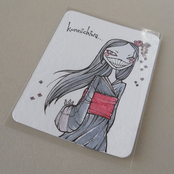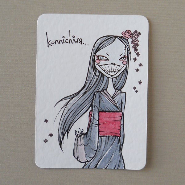 konnichiwa! this pretty zombie geisha has a rather cheeky look in her eye... you know the one. the "i'm coming over there to bite you in the face" kind of look.