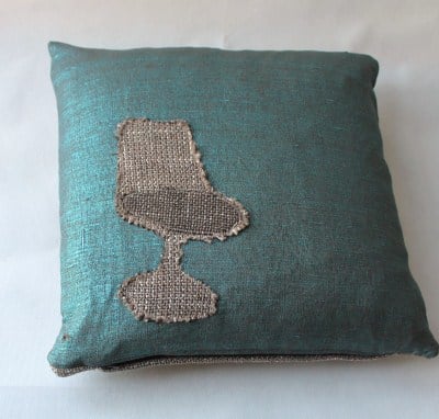 This is a very stylish cushion that will brighten up any room. It is reversible as it has been made using 2 different good quality modern fabrics with appliqued motifs on both sides. One of the fabrics is a tweed-like material woven in various shades of browns, copper and black . On the other side we have used a brown linen material which has a paint effect over it in a metallic blue colour. The applique motif consists of an image of the iconic 1957 Tulip Chair designed by Eero Saarinen.