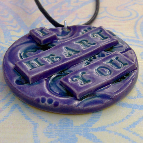 This circular pendant has a heart embossed background with the words "I Heart You" across the front.