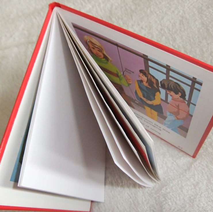 From the outside this notebook looks just like a normal book but inside it has 36 sides of blank white paper (18 pages) together with some pages from the original book including lovely colourful paintings.