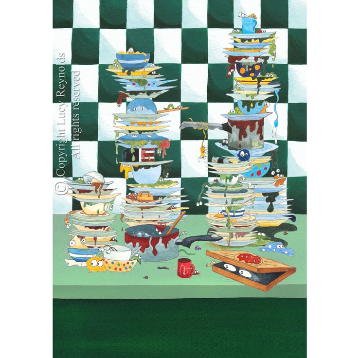An archival quality digital print of 'Messy Kitchen'. Printed on acid-free 310gsm fine art paper using pigment inks and an 8 colour system. The printed area is 10 by 7 inches, printed on A4 paper with a white border.