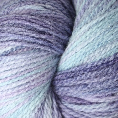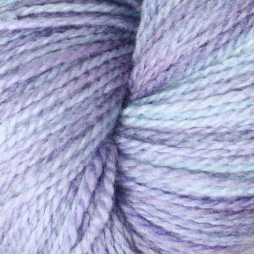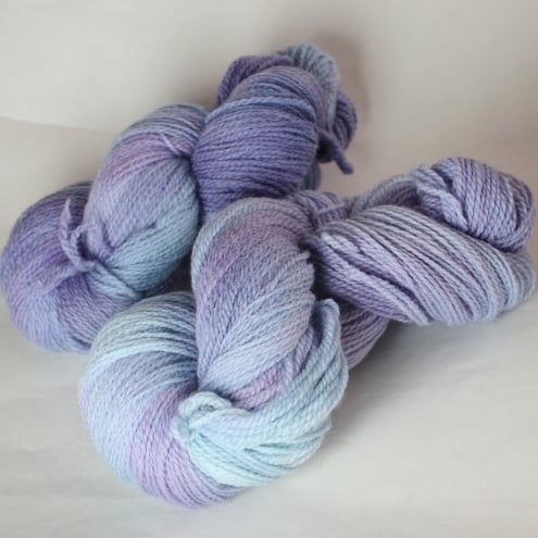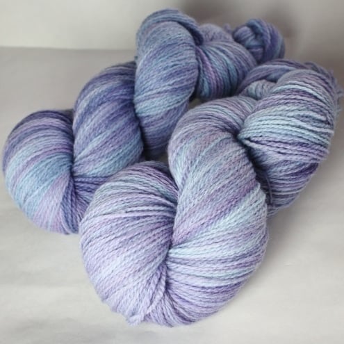 Softest, palest shades of ice blue with lilac and lavender-blue. These are a big, squashy, soft skeins of two-ply merino sport/sock yarn - despite its huge appearance it works up as a thick-ish sock yarn. The yarn has been reskeined as shown in the first three photographs, but one shown in the fourth photo before reskeining, for reference only. There are two skeins available (price shown is for one). One skein has more pale lilac (first photo and front of third and fourth photos) and the other has more darker lavender shades (second photo and back of third and fourth photos). When ordering, please state which skein you would like, or if you plan to use both skeins in the same project, I highly recommend alternating skeins as you work.