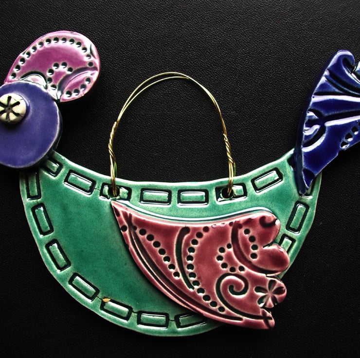 It is made from white earthenware clay, embossed with pattern and glazed in a variety of rich glossy glazes.