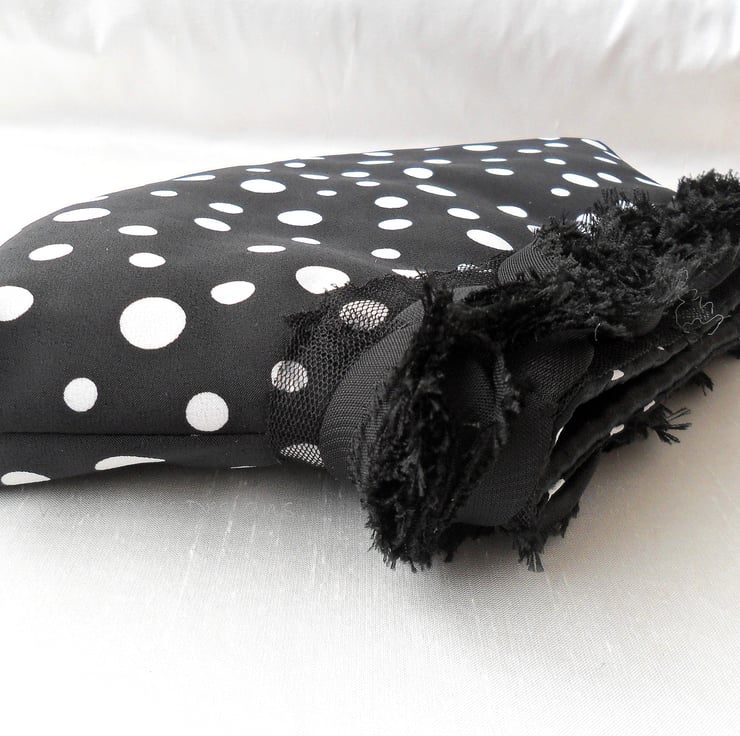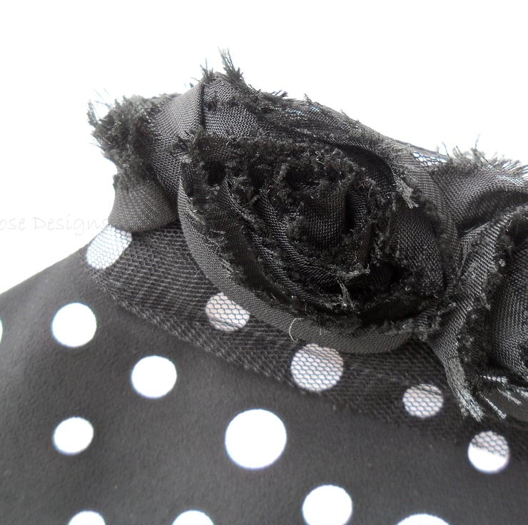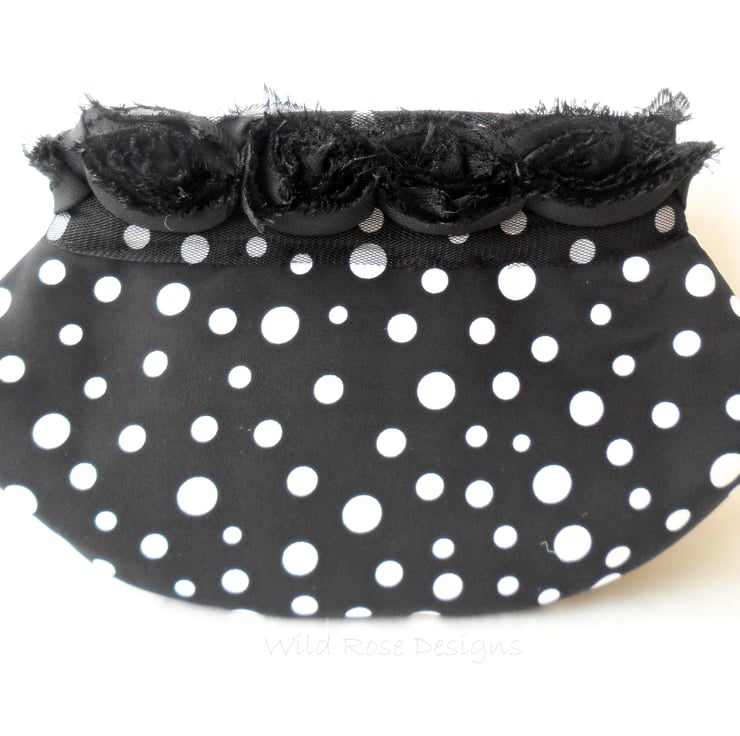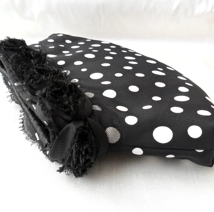 A cute handmade evening clutch bag made in a black and white spotted crepe de chine with a black rosette trim. It is lined in black satin and has 1 slip and 1 zipped pocket and fastens with a magnetic snap.