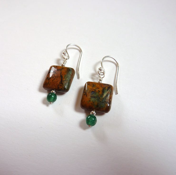 These beautiful natural earthy toned earrings are made from 12mm square rainbow agate and 4mm round aventurine beads with tiny sterling silver beads on sterling silver earwires. Matching bracelet available.
