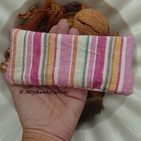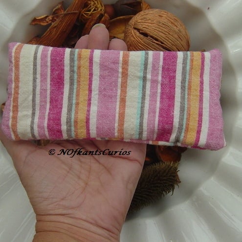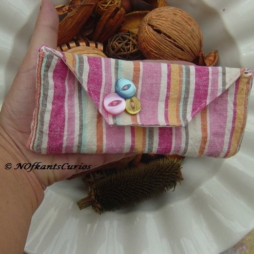 A pretty cotton material glasses case, in muted candy coloured stripes, with three button decoration and magnetic popper closure, to ensure that your glasses, or sunglasses, will emain secure and protected from scratches in the bottom of your handbag.