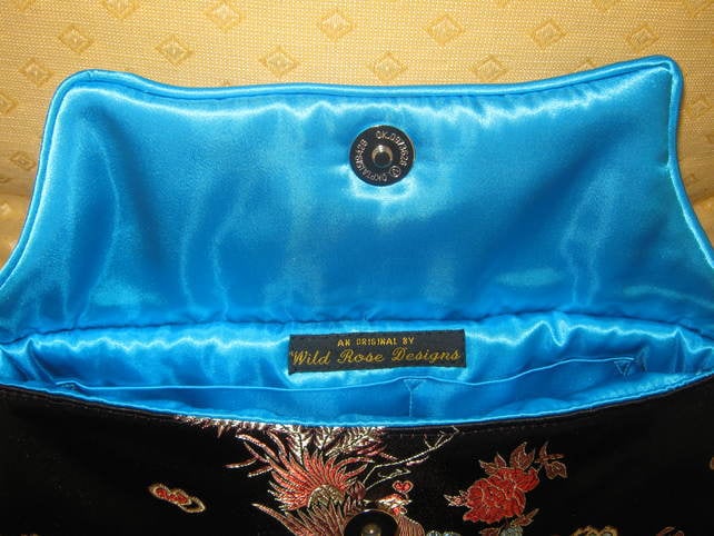 Made in a black satin fabric and trimmed with blue satin piping and self covered buttons. It is lined in blue satin and has a divided slip pocket. The bag fastens with a magnetic snap.