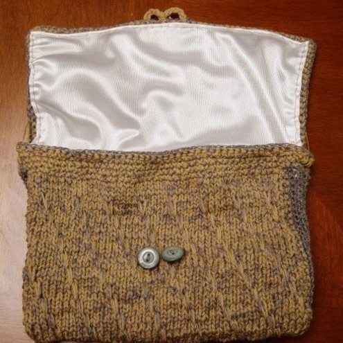 Wool & Cashmere Combo. Hand Knitted & crocheted handbag, with double goldtone & bead strap, fold over closure with two lucite buttons.