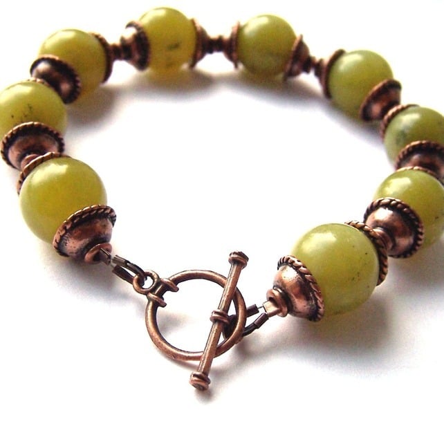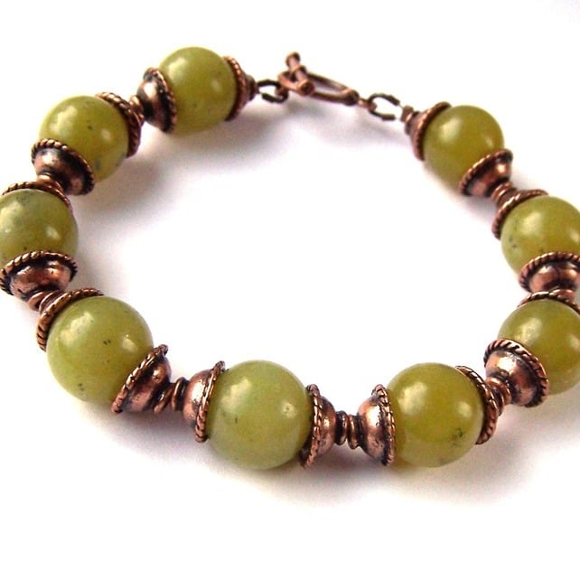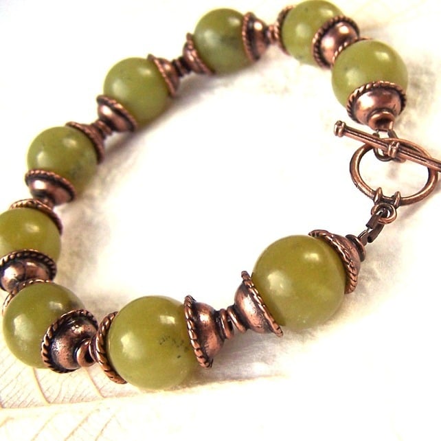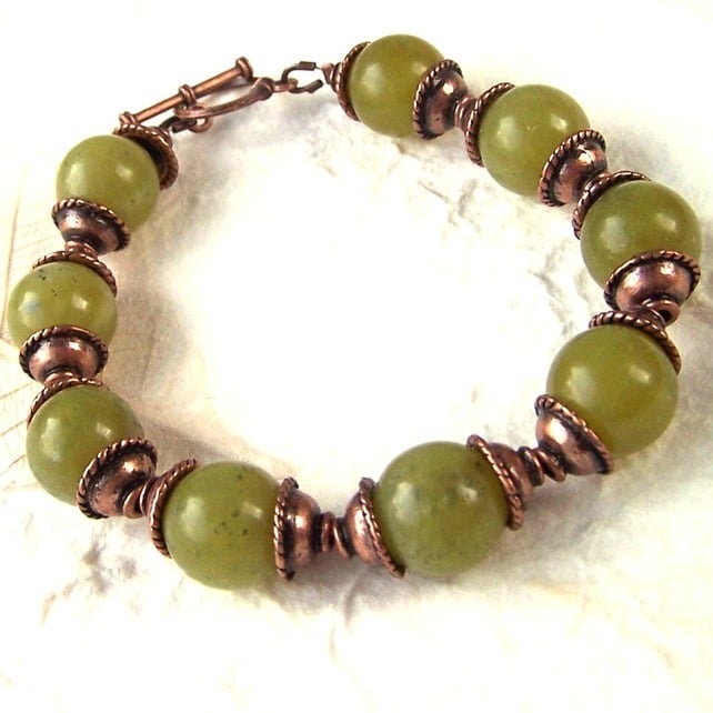 The olivine jade stones in this bracelet are a rich shade of green, and look beautiful against the copper bead caps.