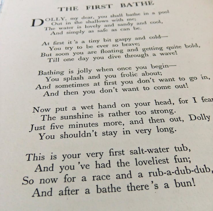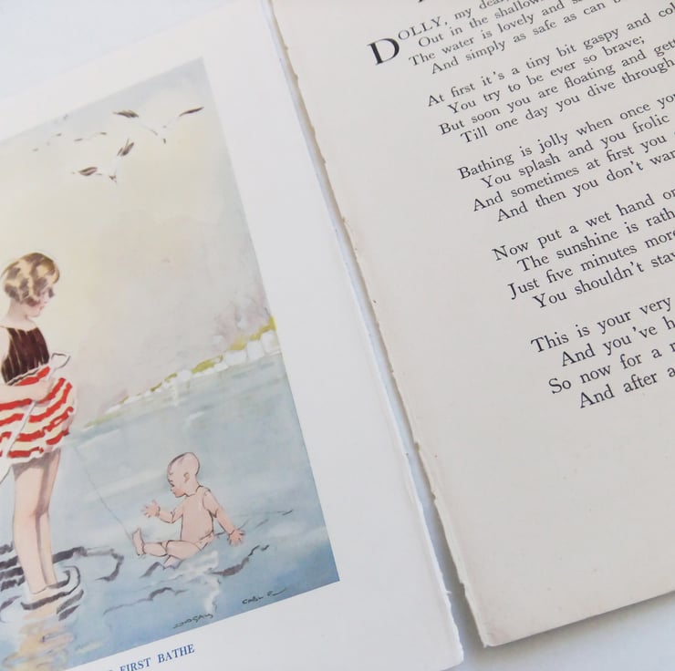 The sweet poem ‘The First Bathe’ by Natalie Joan is printed on a separate page of heavy grade paper which has a lovely, slightly yellowing vintage patina. (There is another short poem underneath which could be cut off by you if you are framing the picture and poem. There is printing on the back of this page but it doesn’t shine through at all as the paper is very thick)