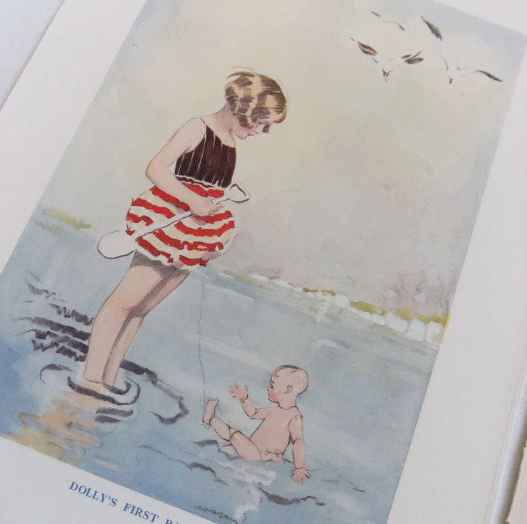 This is lovely vintage illustration and poem. The picture shows a little girl taking her dolly for her first bathe in the sea. There is nothing on the back of this page. This paper has a slight sheen but is not shiny.
