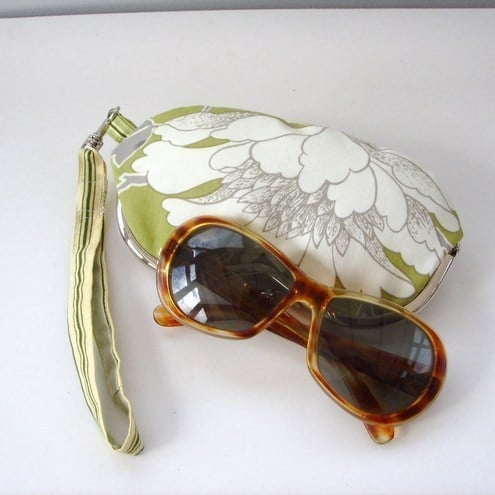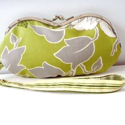 Charming little wristlet purse for glasse, sunglasses or mobile phone in pretty Lime Tree Peony Amy Butler fabric with contrasting lining and removable wrist strap. Measures approx 7x3.5 Pattern placement and wrist strap may vary slightly