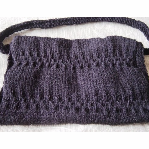 This is a handmade handbag, with 100% Acrylic yarn, has been both knitted and crocheted. The main body of the handbag has been knitted with a carried loop design, in a horizontal design along the handbag, then crocheted together, integrally with the handle to ensure strength and durability of the strap, giving a very textured look.