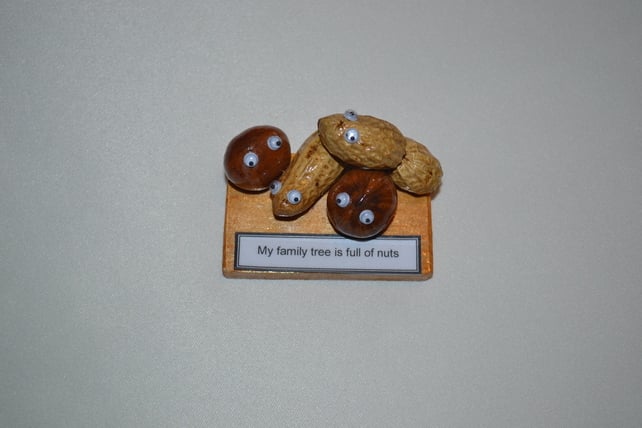Flat wooden base (6.5cm x 4cm) with two "nut people" on it, with a unique decoration and message, which varies from nutty gift to nutty gift. The message on the “Nuts Family” Nutty Gift reads: