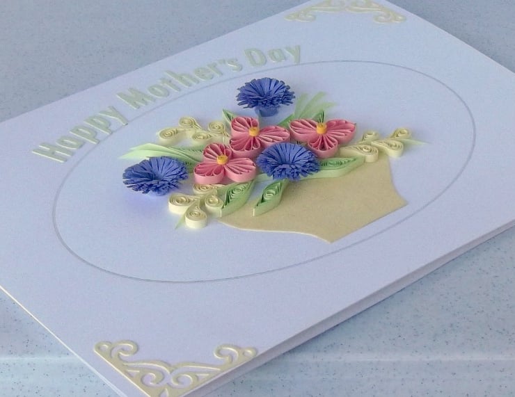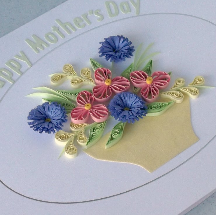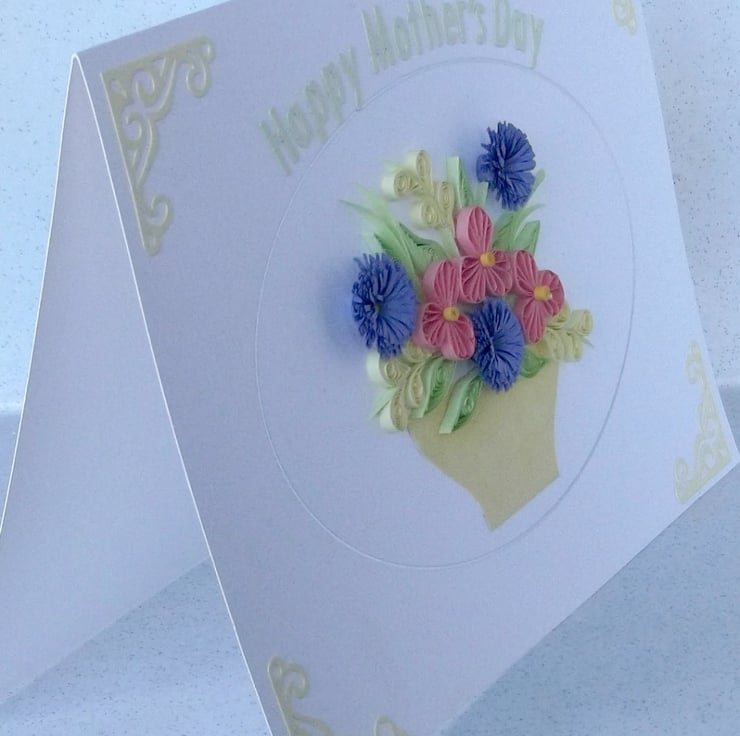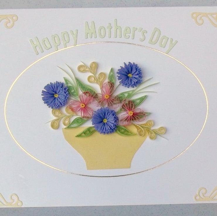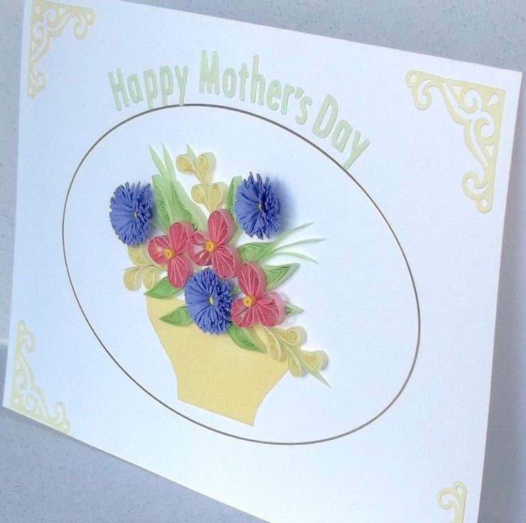 Measuring 6in x 8in approx, this pretty quilled card features an arrangement of quilled flowers with a message reading Happy Mother's Day. The card will be supplied with a co-ordinating envelope, in a protective cellophane sleeve. All cards are packaged carefully to ensure they arrive with you in pristine condition.