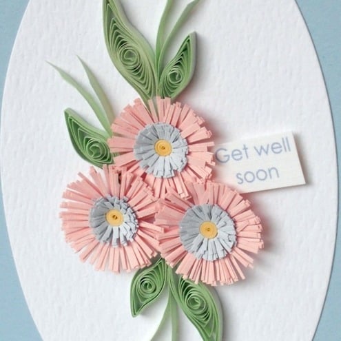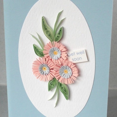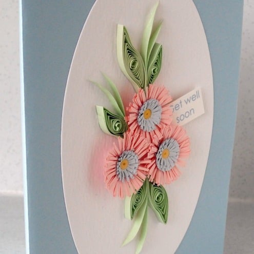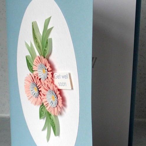 A beautiful handmade quilled card with quilling flowers in coordinating shades, perfect for sending get well wishes to a very special person. The message on the tag can be changed to suit any occasion - "happy birthday", "thank you", "good luck" etc