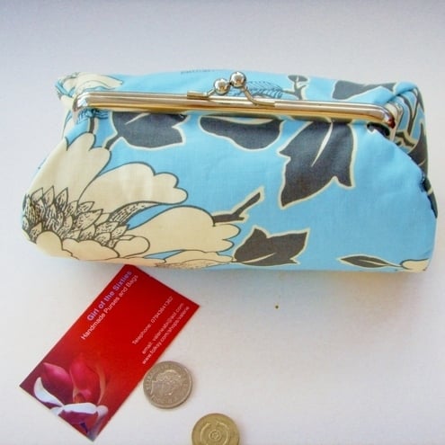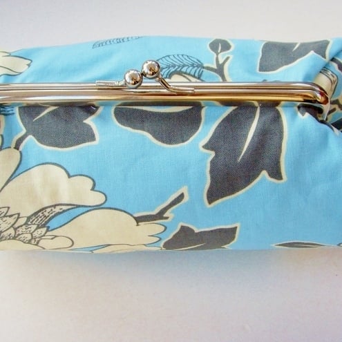 Perfect little clutch for your mobile phone, keys, sunglasses,change and credit cards or even a make-up bag. Pretty Amy Butler Tree Peony fabric with contrasting lining, padding and metal frame clasp.