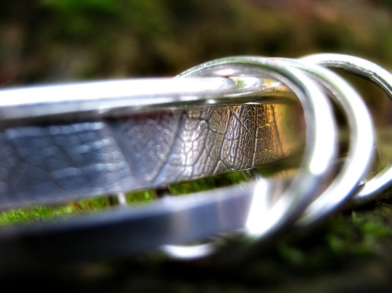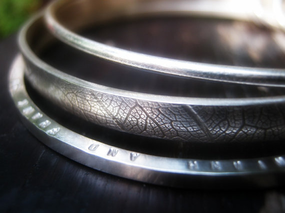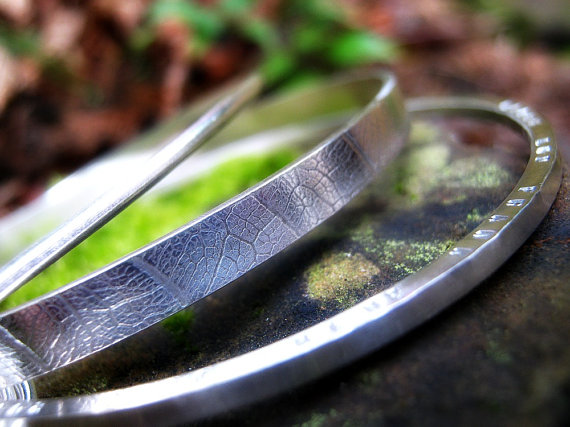 Bangle 2 is an approx 5mm wide band. It is heated up until soft, then I run it through my rolling mill layered with a leaf skeleton, and the pretty leaf pattern is imprinted on to the bangle forever...such a beautiful texture. My fave.