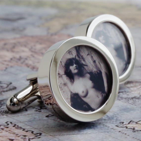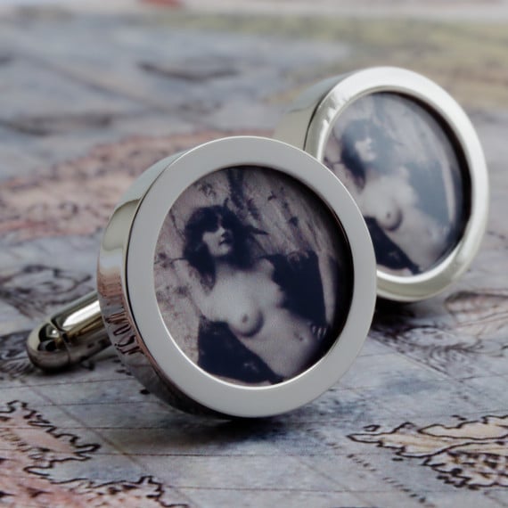 A unique design of a beautiful erotic and seductive woman on a pair of cuff links. From a sepia toned 1920s naughty postcard, this erotic and unique design cuff links are guaranteed to get a smile!