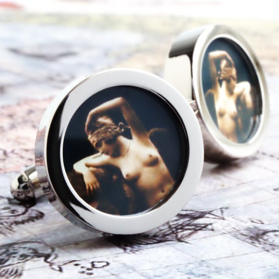 This cheeky pair of unusual cuff links show two beautiful naked French women. These sexy vintage cuff links of a unique design are guaranteed to get a smile! The images comes from naughty 1920s vintage postcards, digitally enhanced.