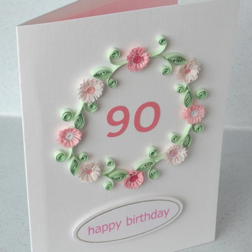 A beautiful quilled 90th birthday card with quilling flowers in coordinating shades of pink for a very special person. Perfect for helping to celebrate a special birthday.