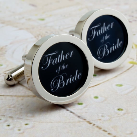 Cuff links for the Proud Father of the Bride with Father of the Bride written in classic script black lettering on a white background. These elegant cuff links are classic in design and uber stylish.
