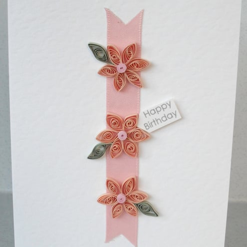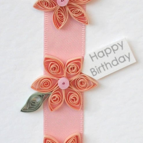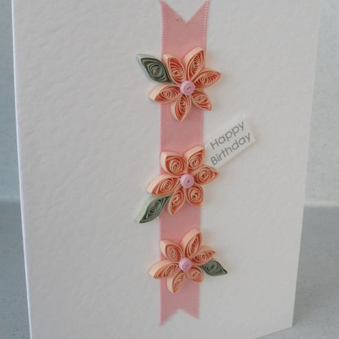 A beautiful quilled card with quilling flowers in coordinating shades of pink and peach for a very special person.