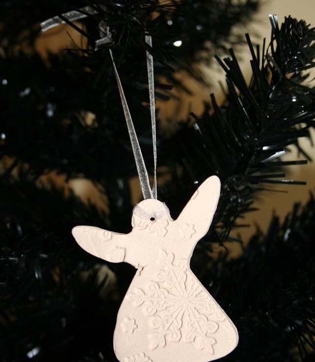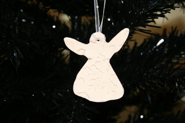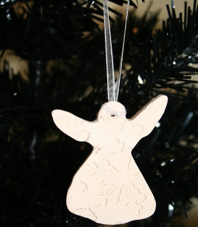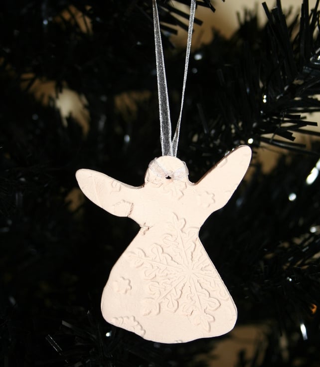 Handmade ceramic angel hanging decoration, embossed with snow flake design, each angel is slightly different, finished in natural fired colour with white organza ribbon for hanging.
