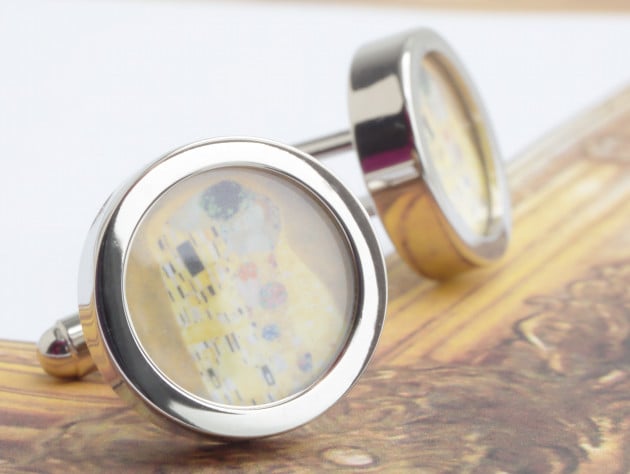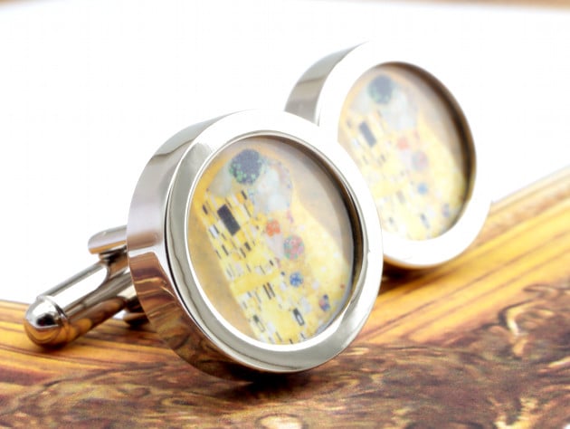 Cuff links of Klimt's iconic painting The Kiss from a series of cuff link designs of famous paintings by some of the world's best loved artists.