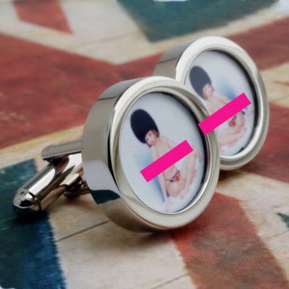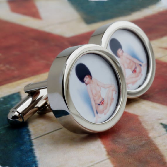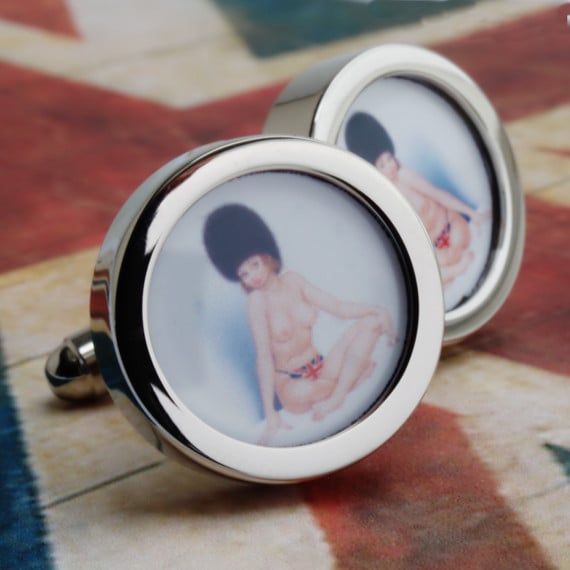 What could be more English than these nude pin up cuff links with a topless woman wearing Union Jack knickers and a Busby hat on her head. Lots of fun and not a little bit kitch, no guy could resist her naughty but nice charms.