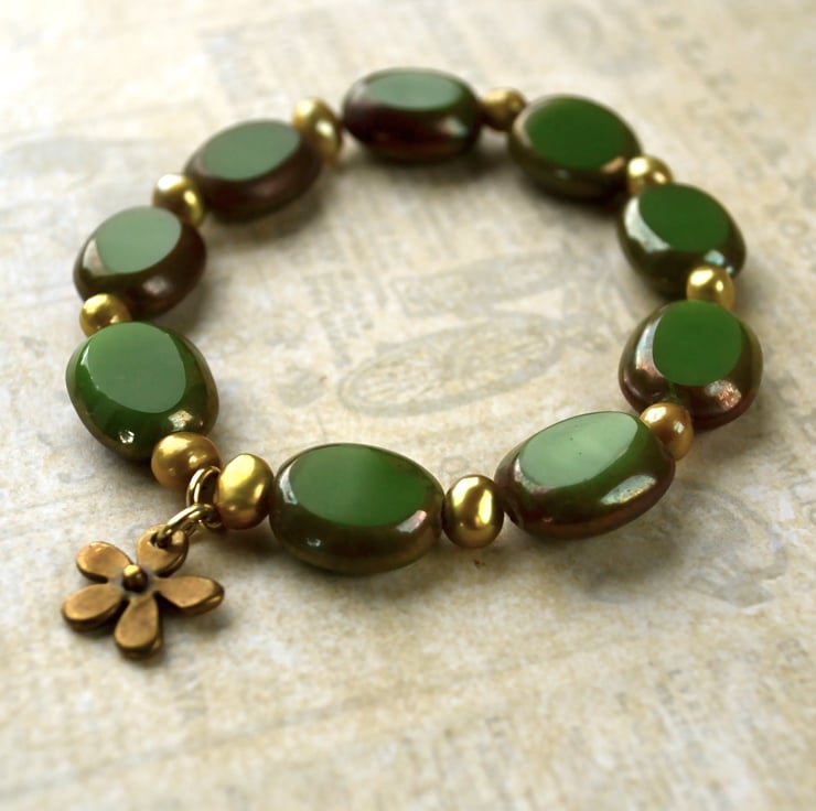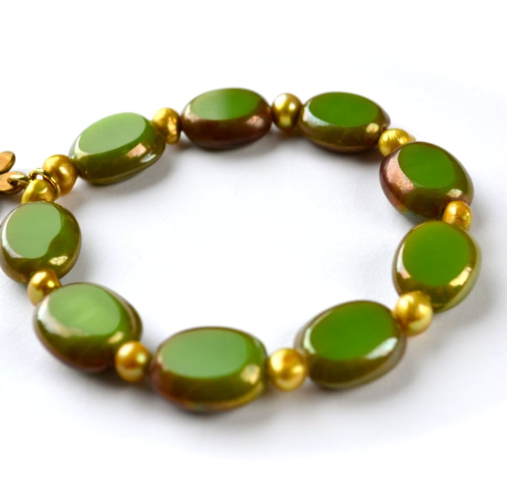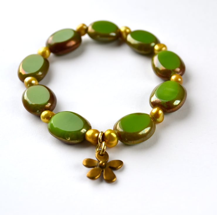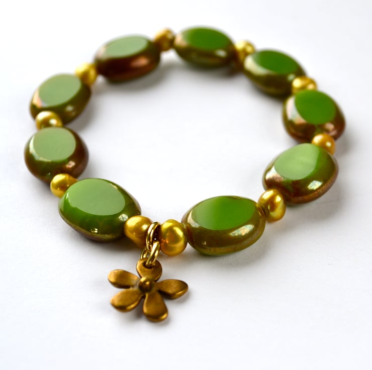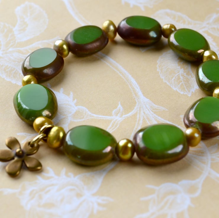 All the components of this bracelet are high-quality. There are Indian lamp glass green oval beads, with a beautiful shiny lustre, sweet little greeny gold freshwater pearls, and a shiny antique gold finish nickel-free metal flower charm.