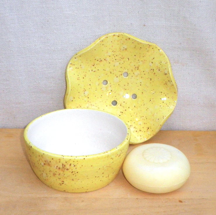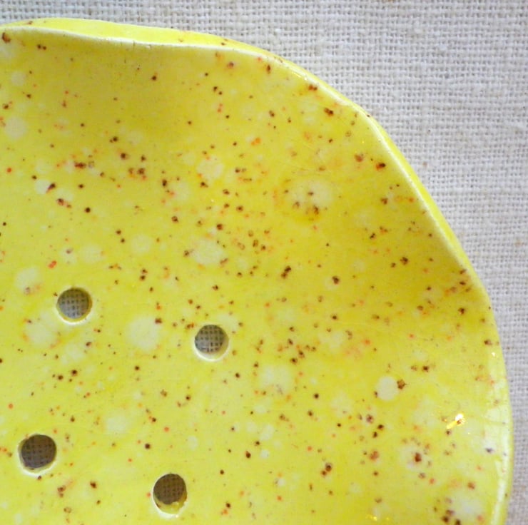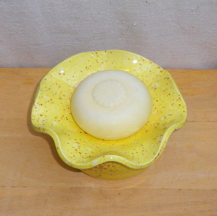 I threw this soapdish on my potters wheel using strong white earthenware clay and I have finished it in a pretty yellow speckle glaze.