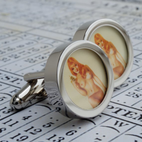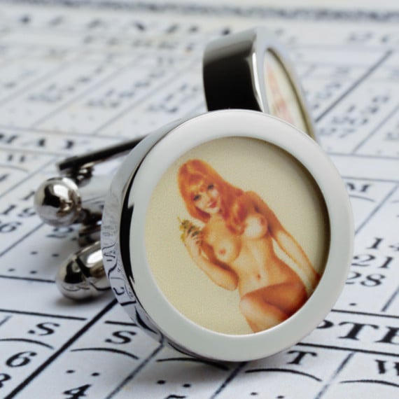 Naughty nude cuff links taken from an illustrated vintage pin up calendar. Lots of fun, this luscious red head is sure to get a smile.