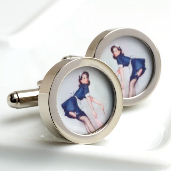 Pinup cufflinks from a 1950s vintage postcard of a gorgeous gal dressed as a maid, flashing her stocking tops as she sweeps the dust under the rug.
