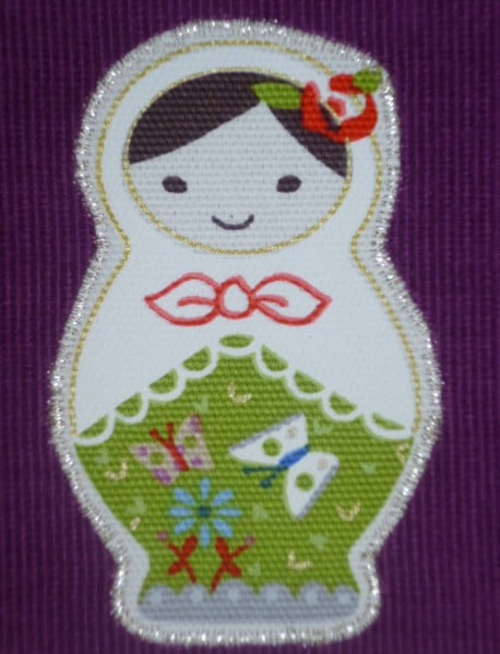 Pride of place in the centre of the bag sits a pretty Russian doll in green and white with a red rose in her hair. She sits on a gorgeous rich pink cotton corduroy fabric, and has been appliqued into place with shimmering silver thread. The top and bottom panel of this bag are made from a pretty green cotton fabric which is sprinkled all over with pink dots. It is the perfect companion to the pretty green doll.