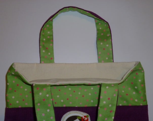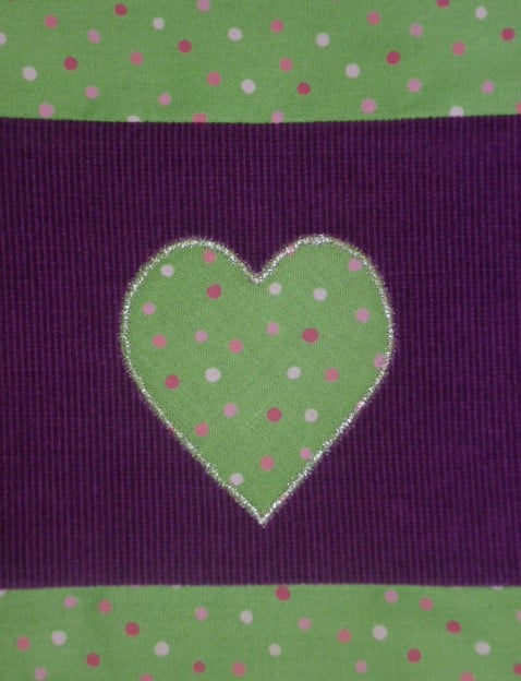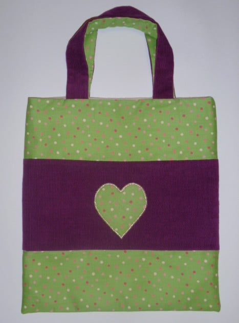 On the back the three panels are the repeated, and the centre sits a heart in the green dotty fabric, surrounded by sparkly silver thread. The bag's handles are made from the lovely pink corduroy, with the green spoty fabric on the underside.