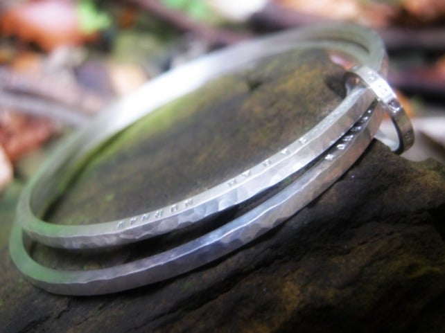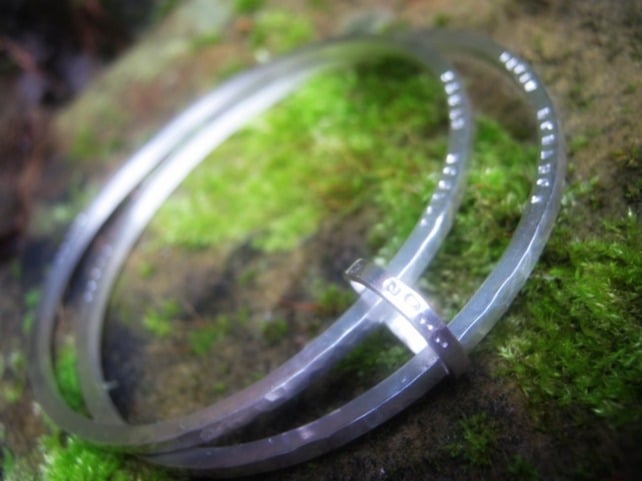 Each bangle is hand stamped letter-by-letter with the words of your choice, and they can hold max 80 characters each, including spaces and punctuation.