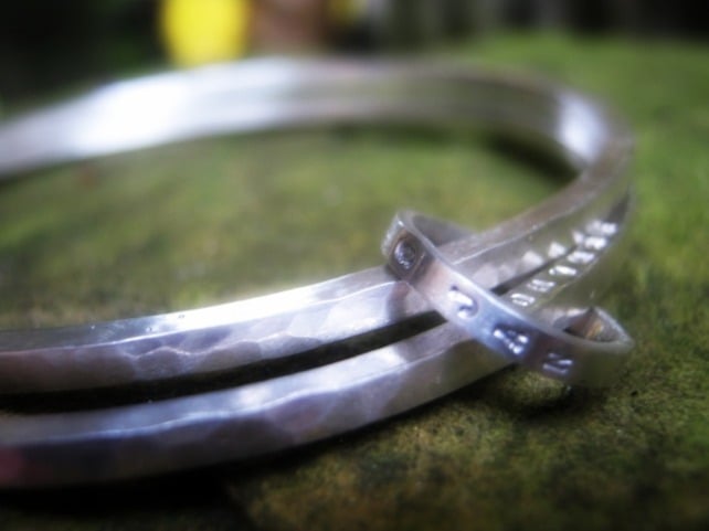 The pictures that you see are from a custom order. The gentleman bought this bangle for his partner, and they had their names stamped on the bangles (One on each), and the date that they met was stamped on the little ring.