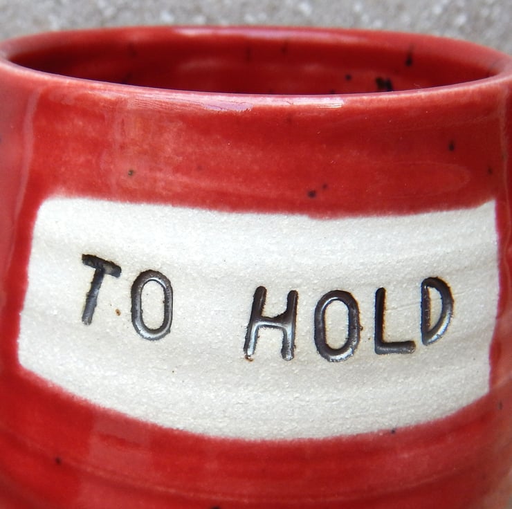 Hand thrown on my pottery wheel using strong white stoneware clay, I've added the words " to have " and " to hold " and highlighted the lettering in bronze.