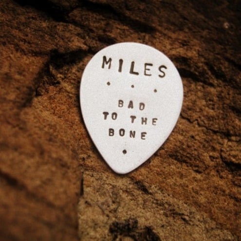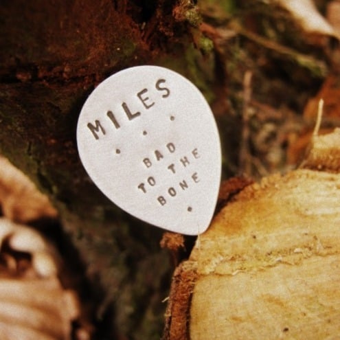 Sterling silver guitar plectrums, hand stamped letter-by-letter with you chosen words, names, lyrics or dates!