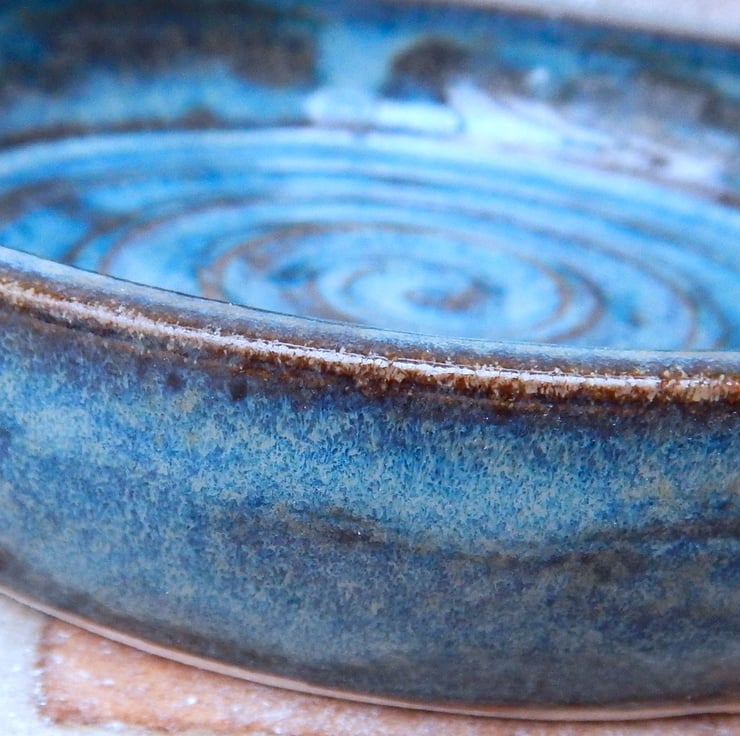 I threw this oven-to-table dish on my pottery wheel using strong white stoneware clay and finished it in my favourite dark aquamarine blue reactive glaze.